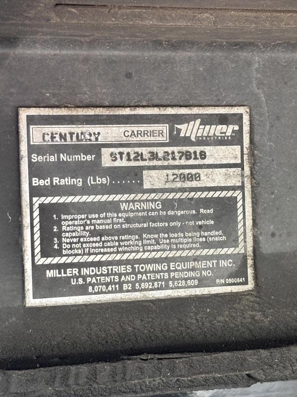 Century 21.6 FT Steel carrier with Independent Wheelift. Full-Length Slide Pads. 8,000lb Winch. Hydraulic pump. Painted Black. Backup lights, backup Alarm. Tow light socket. Bed anti-tilt lockout/ right and left Chain Trays. Safety Chains (2-front, 2 rear) Dual lighted controls. FMVS 108 Lighting group. Wheelift safety pin. Full Height cab protector.Stainless steel tail light plates. Cable Roller guide. Cable tensioner. Positive lock-down. Prewired Junction box. Straps and Ratchets for Wheelift., Ratchets, 11 Chain lock package body- Body Serial # ST12L 2k248219