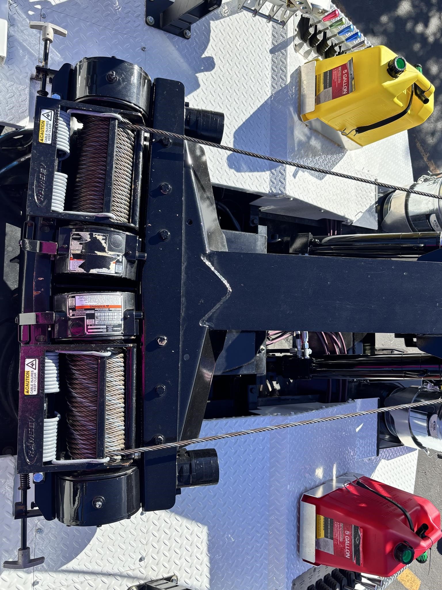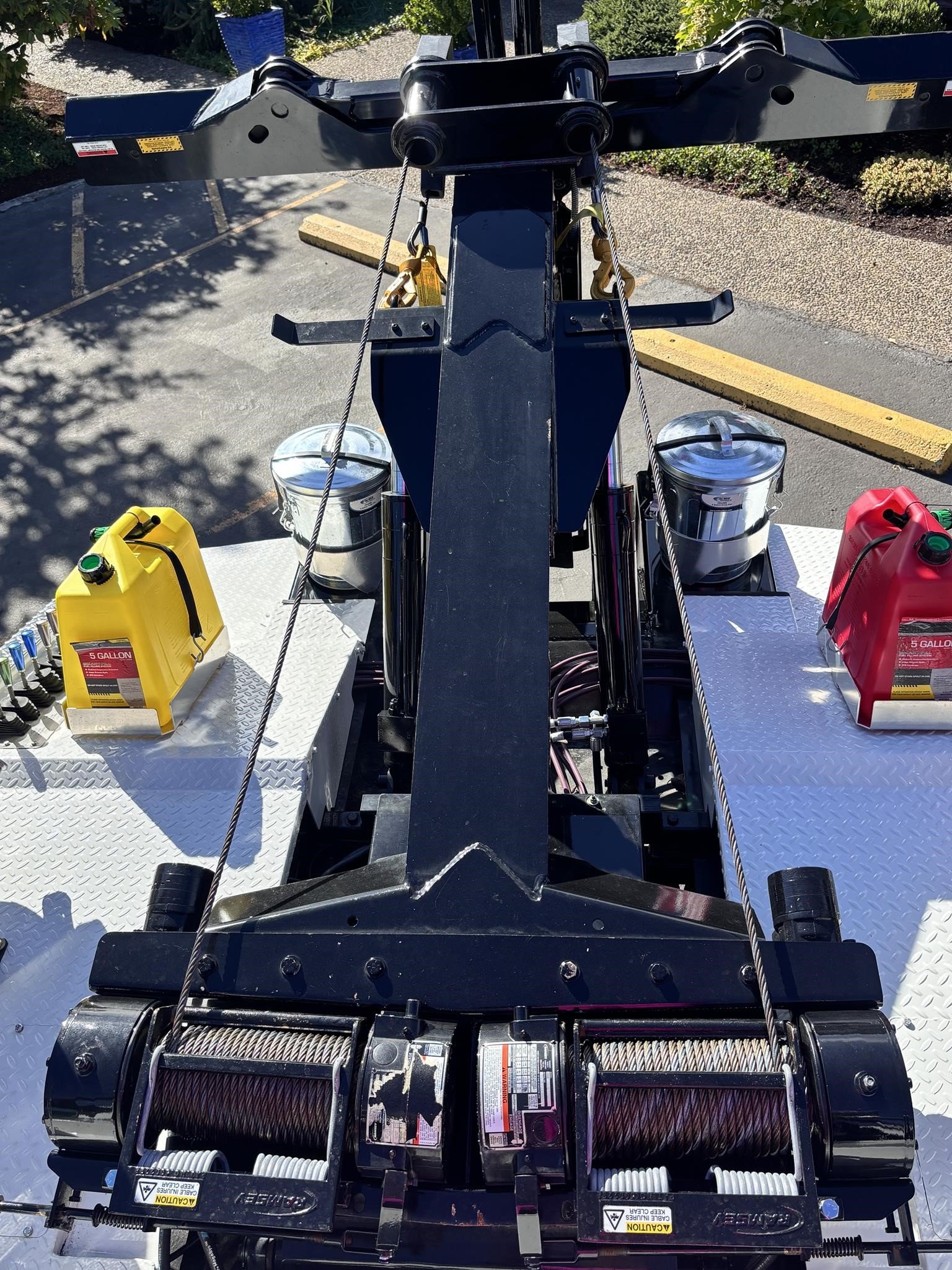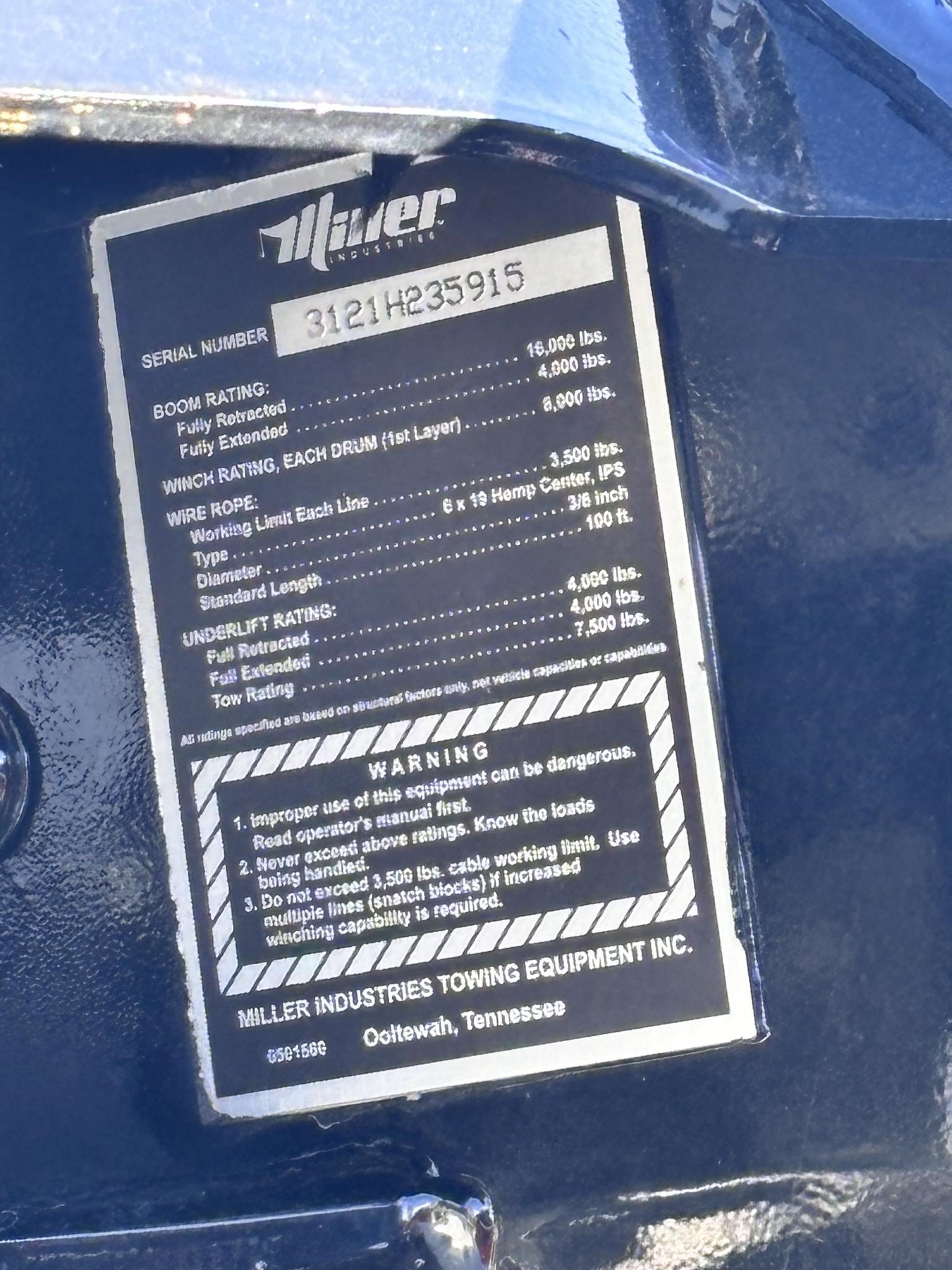 Century 312, 8-ton Integrated Boom & Wheel Lift System -express Hydraulic Hook-Up. Clutch Pump In-Cab Remote Control Pendant on Cord with 8 Functions. Dual Manual Controls 1 Pair of Safety Straps. (2) 3/8" x 100' Cable Assembly Tool Compartment, Left & Right Hand Side Adjustable Modular Body Power Boom Elevation with Holding Valve, Dual 8,000 lb. Variable-Speed Hydraulic Winches with Safety Chains in Rear Pockets. 5/16, Grade 70. 360° Directional Boom End Swivel Cable Tensioner. Federal Standard #108 Light Group Wiring Harness with Junction Box. Mud Flaps Back-Up Alarm. Power Fold for Stinger Storage Self Centering Crossbar with 3" Pivot Pin roller Guided Hose Tracking System Pre-assembled and Tested. Boom Specifications: Lift Height at Maximum Elevation Retracted 78", Extended 105" Reach Past Tailgate Minimum Elevation (Extended) 50" Maximum Elevation (Extended) 22" Boom Rating at Boom Swivel Retracted 16,000 lbs. Extended 4,000 lbs. Maximum Boom Elevation 33° WHEEL LIFT SPECIFICATIONS Retracted Distance from Tailgate at Normal Tow Position 51" Extended Distance from Tailgate at Normal Tow Position 85 1/2" Maximum Hydraulic Extension 33 3/4" Lift Rating 4,000 lbs. Tow Rating 7,500 lbs. Serial# 3121H23915