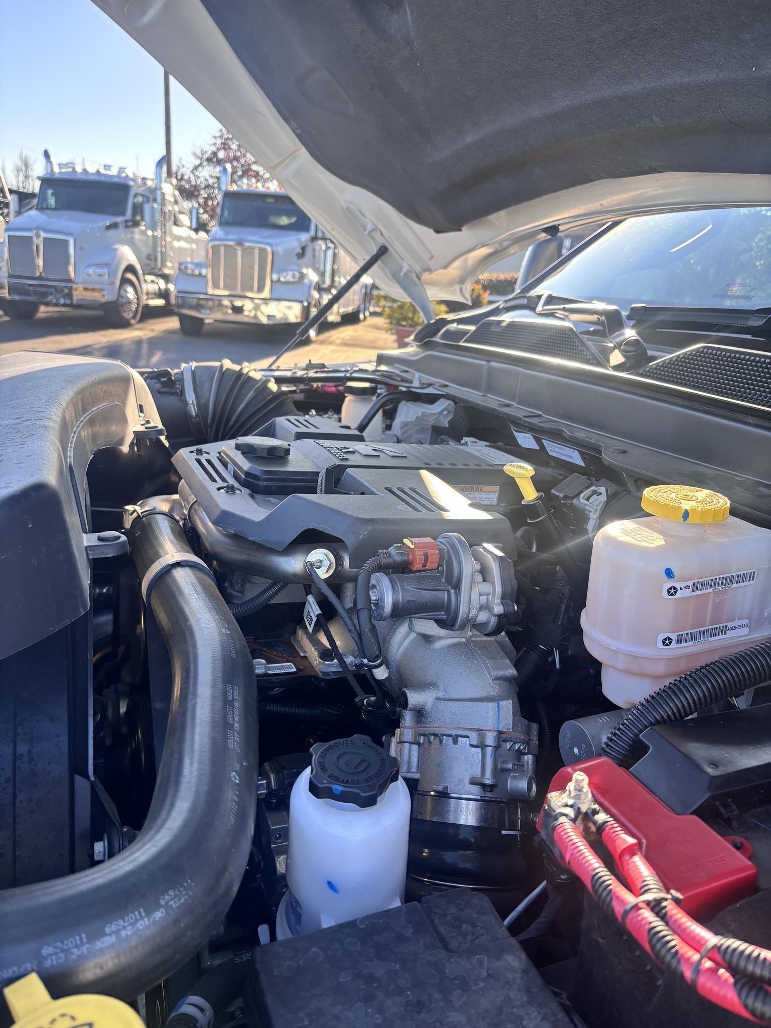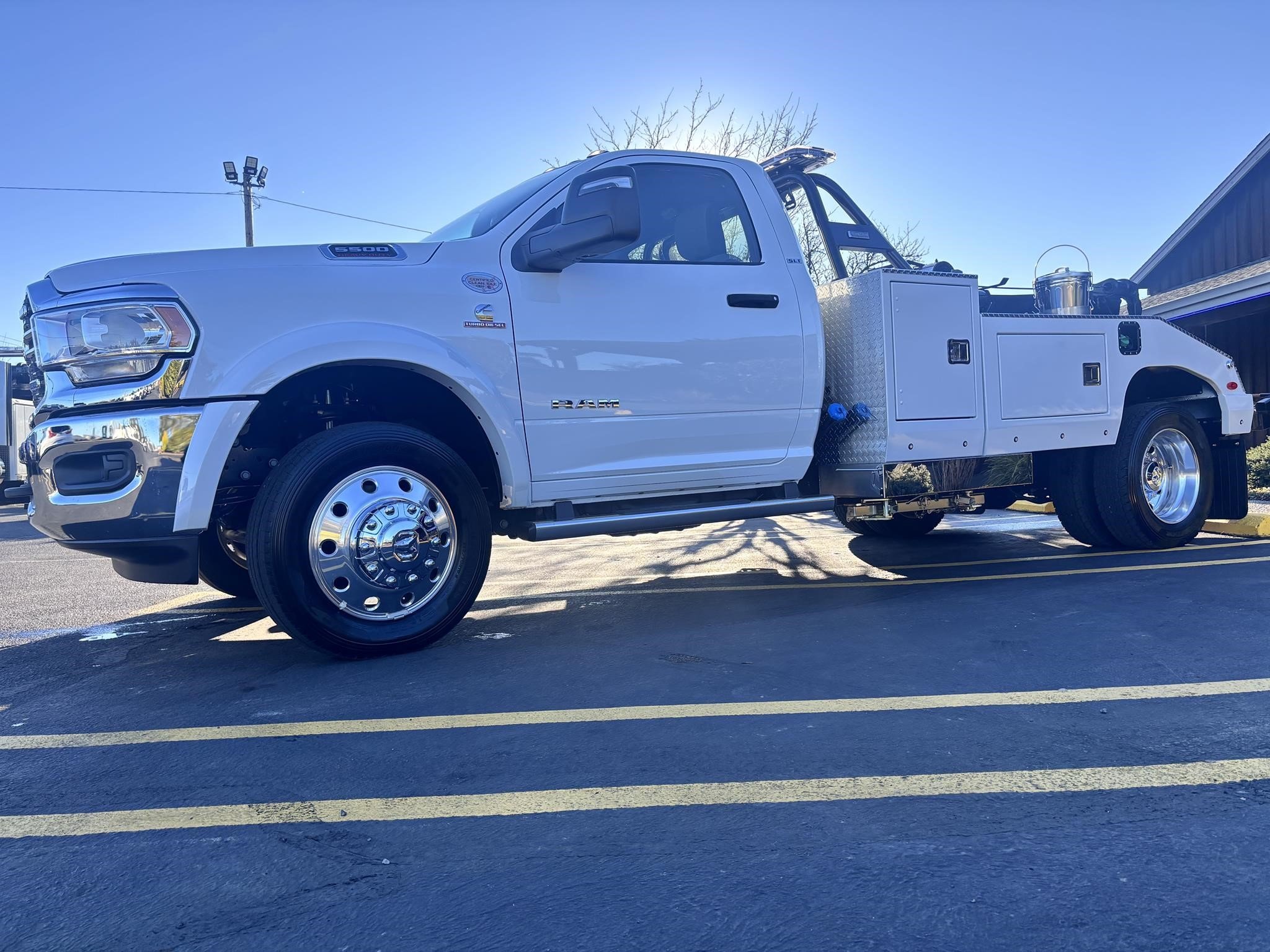 RAM 5500 SLT Reg Cab w/ Cummins 6.7L I-6 OHV Direct Diesel Injection, 24 Valve Intercooled Turbo, 325HP @ 3,000 rpm, 750 lb-ft @ 1,600 rpm, 136 amp Alternator, 6 Speed Automatic Aisin AS68RC, Exhaust brake. Engine Block Heater, 120" CA, 4 Wheel Disc Brakes w/ Front and rear Vented Discs, Non-Independent Front Suspension, Rear Leaf Suspension, 4 Wheel Anti-Lock Braking System, Daytime Running Lights, Dual Air Bags, A/C, 5" Touch Screen AM/FM/CD Radio, Cruise Control, Power Windows, Power Door Locks, 40-20-40 Split Bench Seat, Vinyl Black Material, Upfitter Switches (5). 19,500 GVWR, Chrome Cab Steps, 22 Gal Fuel Tank, 225/70R19.5 Tires w/ 19.5 Aluminum wheels 4x4 Package Transfer case Skid plate shield, shift on the fly, Block heater.