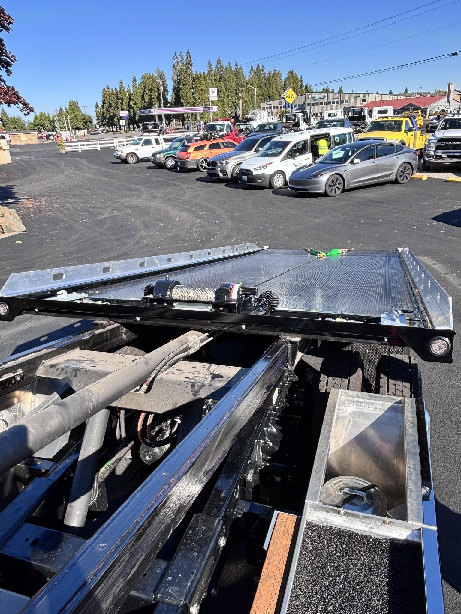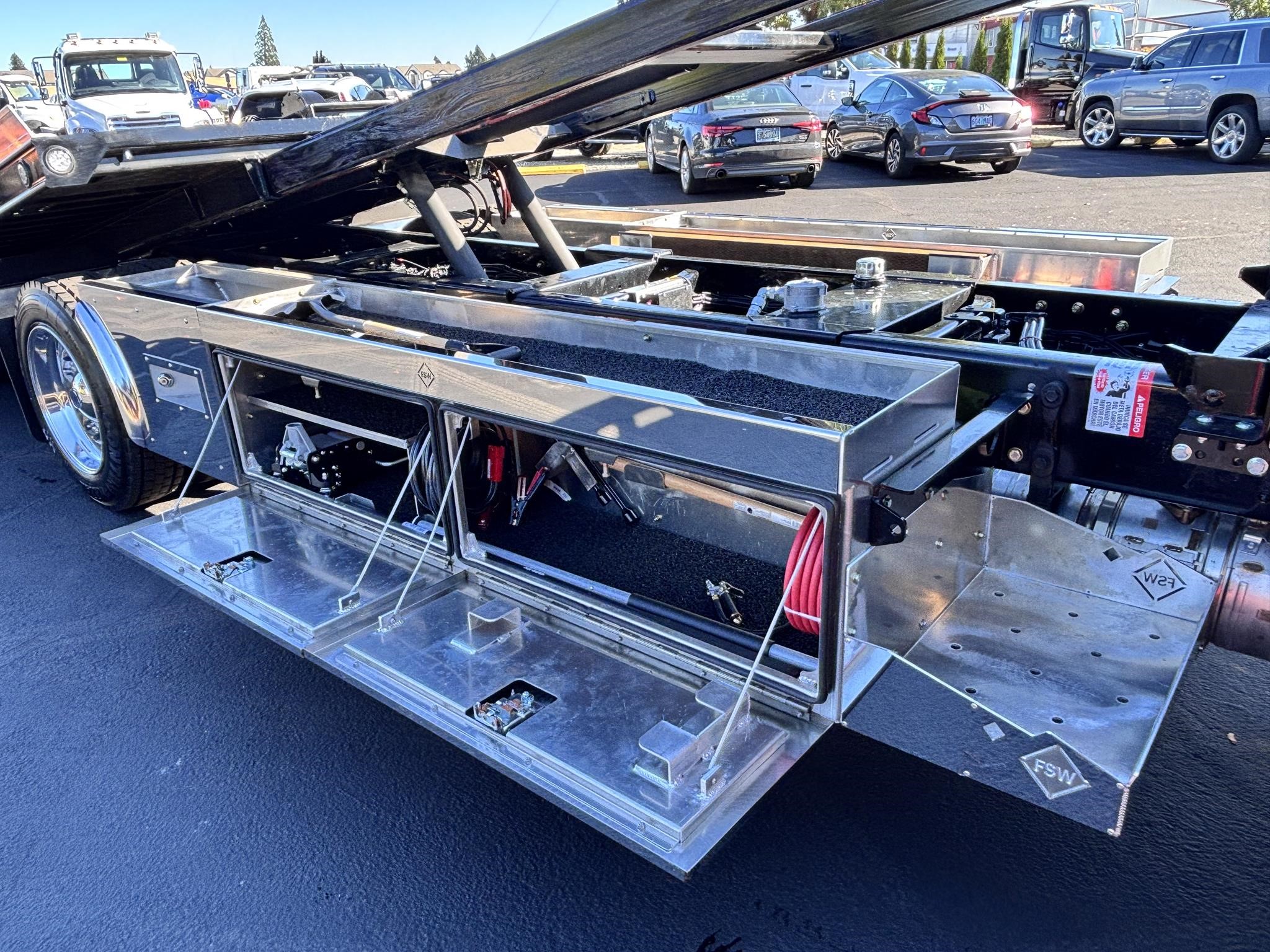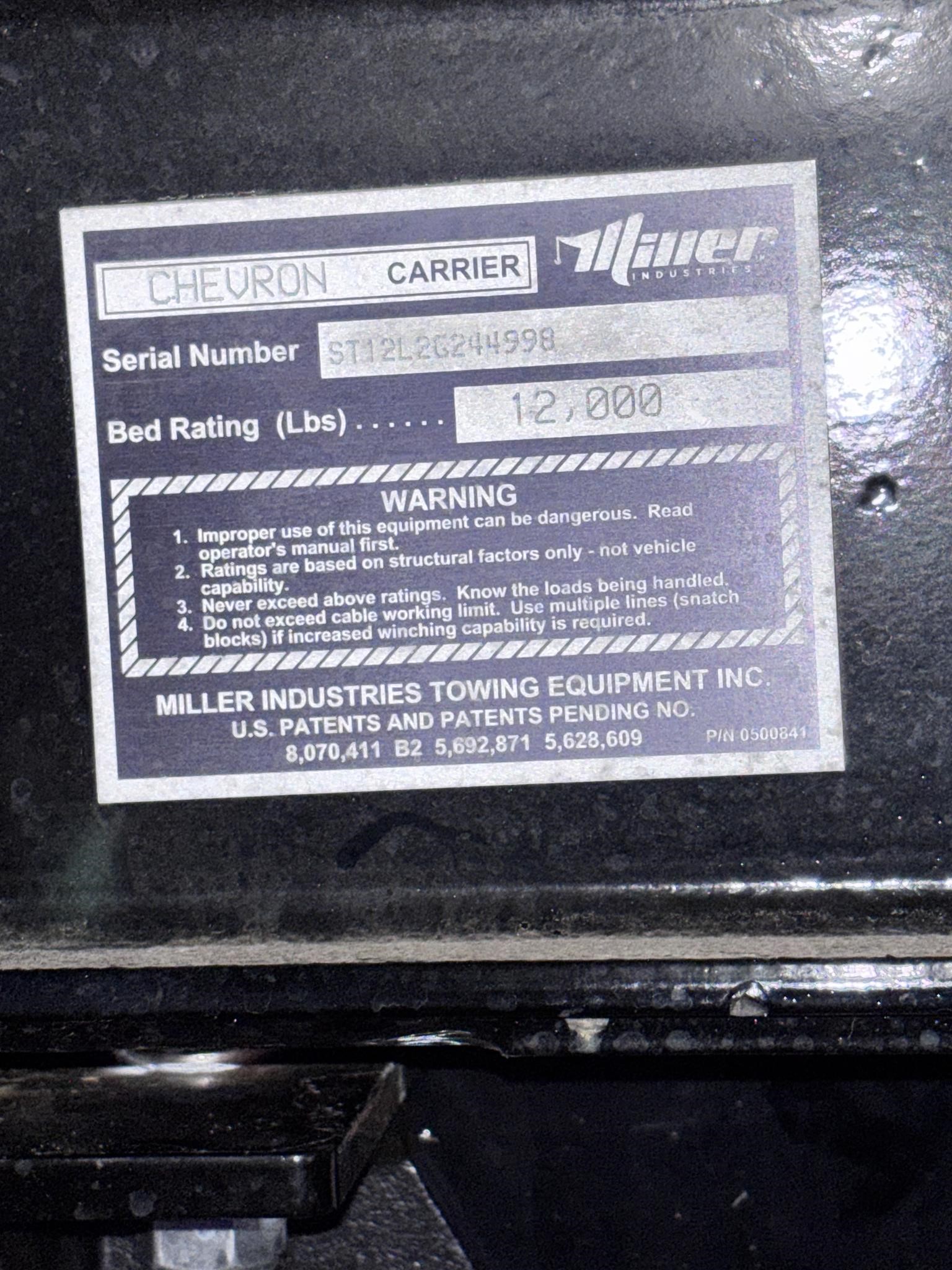 Chevron 21.5' Steel LCG (Low Center of Gravity) Carrier w/ Wheel Lift, 3/16 Deck Plate, 3x2 Corten Tube Crossmembers on 8 inch Centers, (4) Rear Chain Locks, (2) Front Chain Locks, (6) Floor Plate Chain Locks (3 per side), 8,000lb Worm Gear Winch, 3/8" x 50' Winch Cable, Illuminated Dual Controls, FMVSS 108 Lamp Group Shock Mounted Lighted, Direct Mount Pump, Cable Roller Guide w/ Tensioner, Winch Free Spool Extension, Back-Up Alarm, (2) Safety Chains, Mechanical Anti-tilt, Black Body Paint, 102" Wide Body, Inboard Tilt Cylinders, Floor Level Roll Formed w/ Punched Stake Pockets, 4,000lb Wheel Lift w/ Releasable L Arms, Fully Hydraulic Wheel Lift, (2) Safety Straps & Ratchets, (2) Rear Safety Chains, Body Lock w/ Nylatron Roller Bearings, & 12,000lb Deck Load Rating. Body Serial#