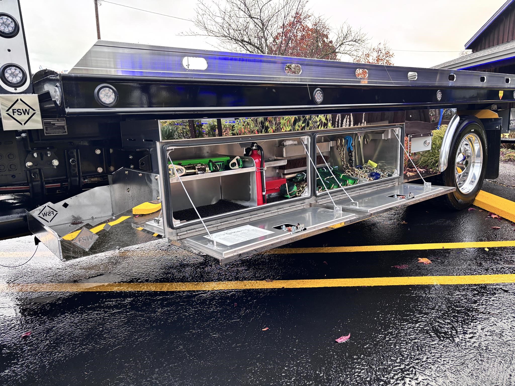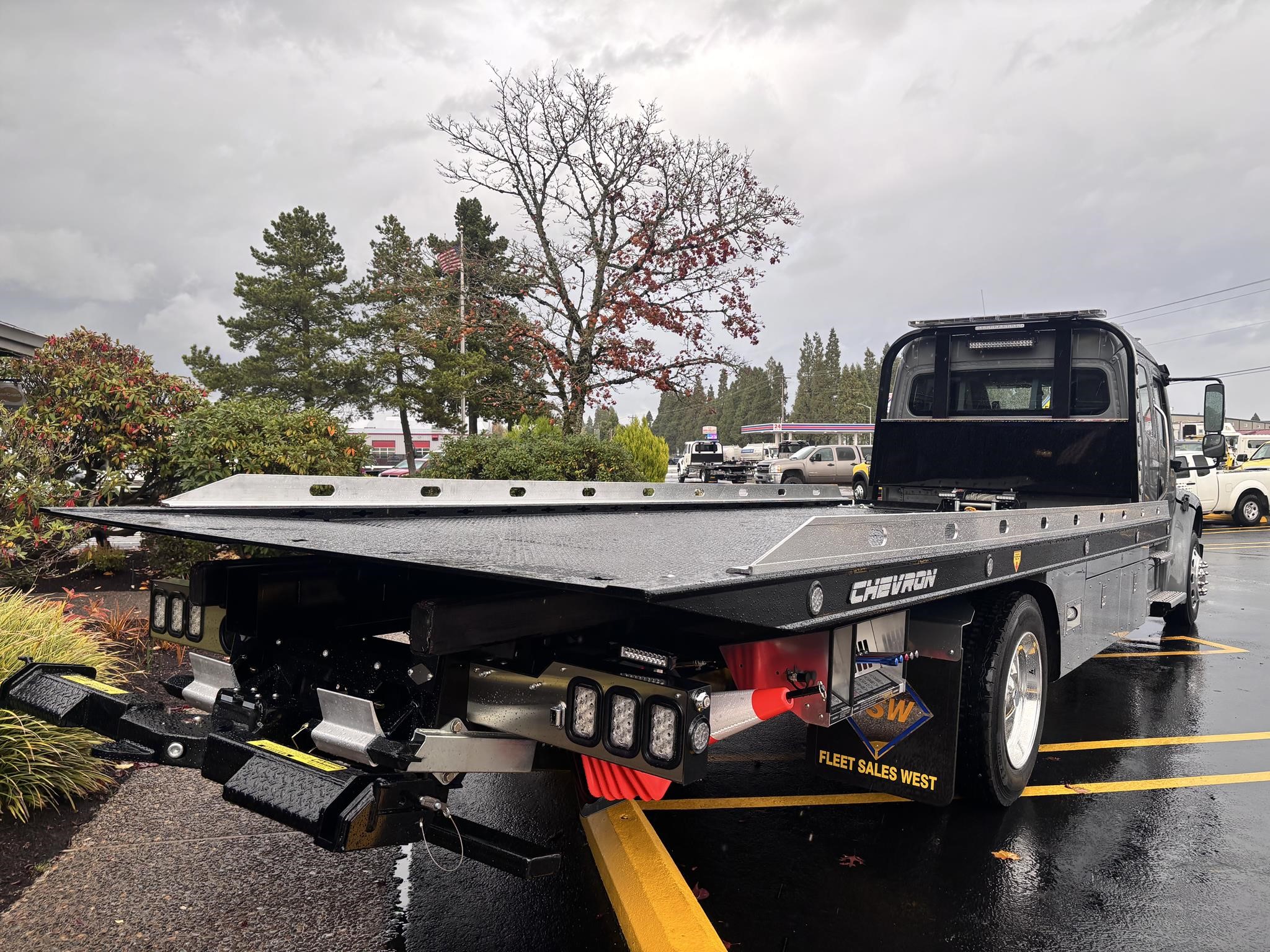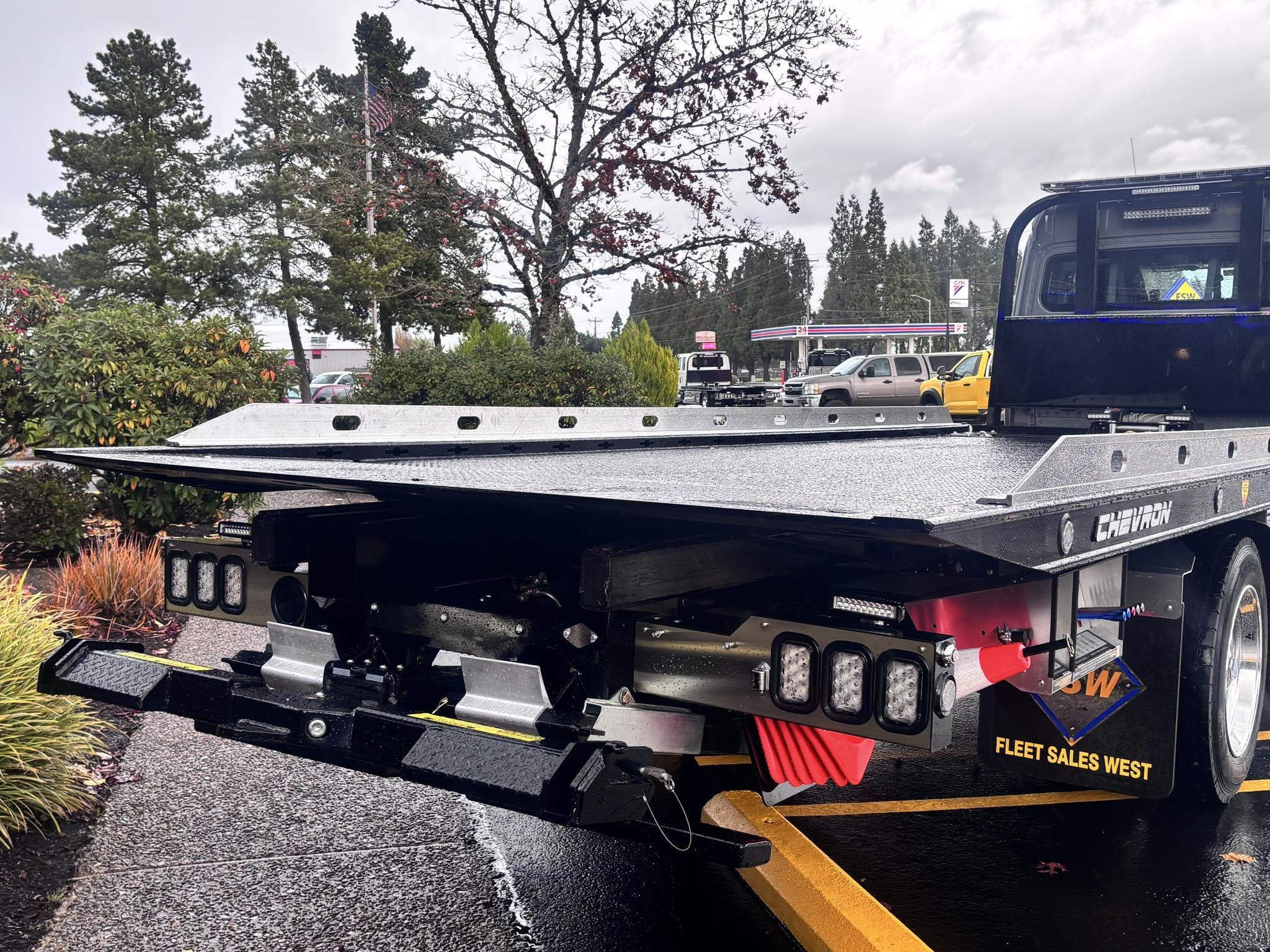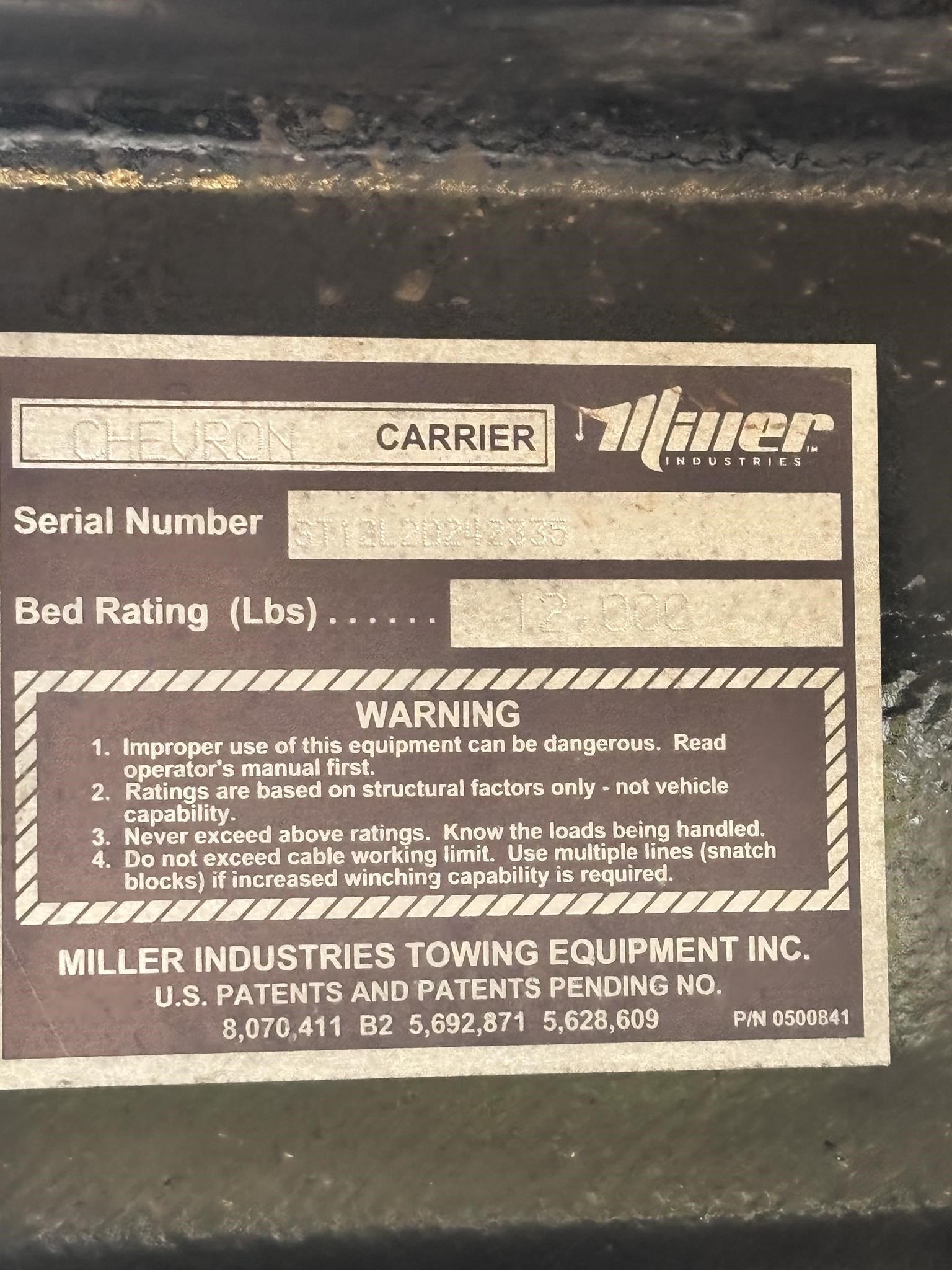 Chevron 21.6' Steel LCG (Low Center of Gravity) Carrier w/ Wheel Lift, 3/16 Deck Plate, 3x2 Corten Tube Crossmembers on 8 inch Centers, (4) Rear Chain Locks, (2) Front Chain Locks, (6) Floor Plate Chain Locks (3 per side), 8,000lb Worm Gear Winch, 3/8" x 50' Winch Cable, Illuminated Dual Controls, FMVSS 108 Lamp Group Shock Mounted Lighted, Direct Mount Pump, Cable Roller Guide w/ Tensioner, Winch Free Spool Extension, Back-Up Alarm, (2) Safety Chains, Mechanical Anti-tilt, Black Body Paint, 102" Wide Body, Inboard Tilt Cylinders, Floor Level Roll Formed w/ Punched Stake Pockets, 4,000lb Wheel Lift w/ Releasable L Arms, Fully Hydraulic Wheel Lift, (2) Safety Straps & Ratchets, (2) Rear Safety Chains, Body Lock w/ Nylatron Roller Bearings, & 12,000lb Deck Load Rating. Body Serial #
