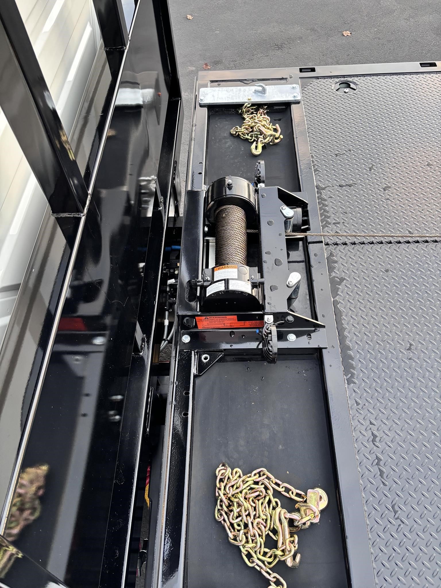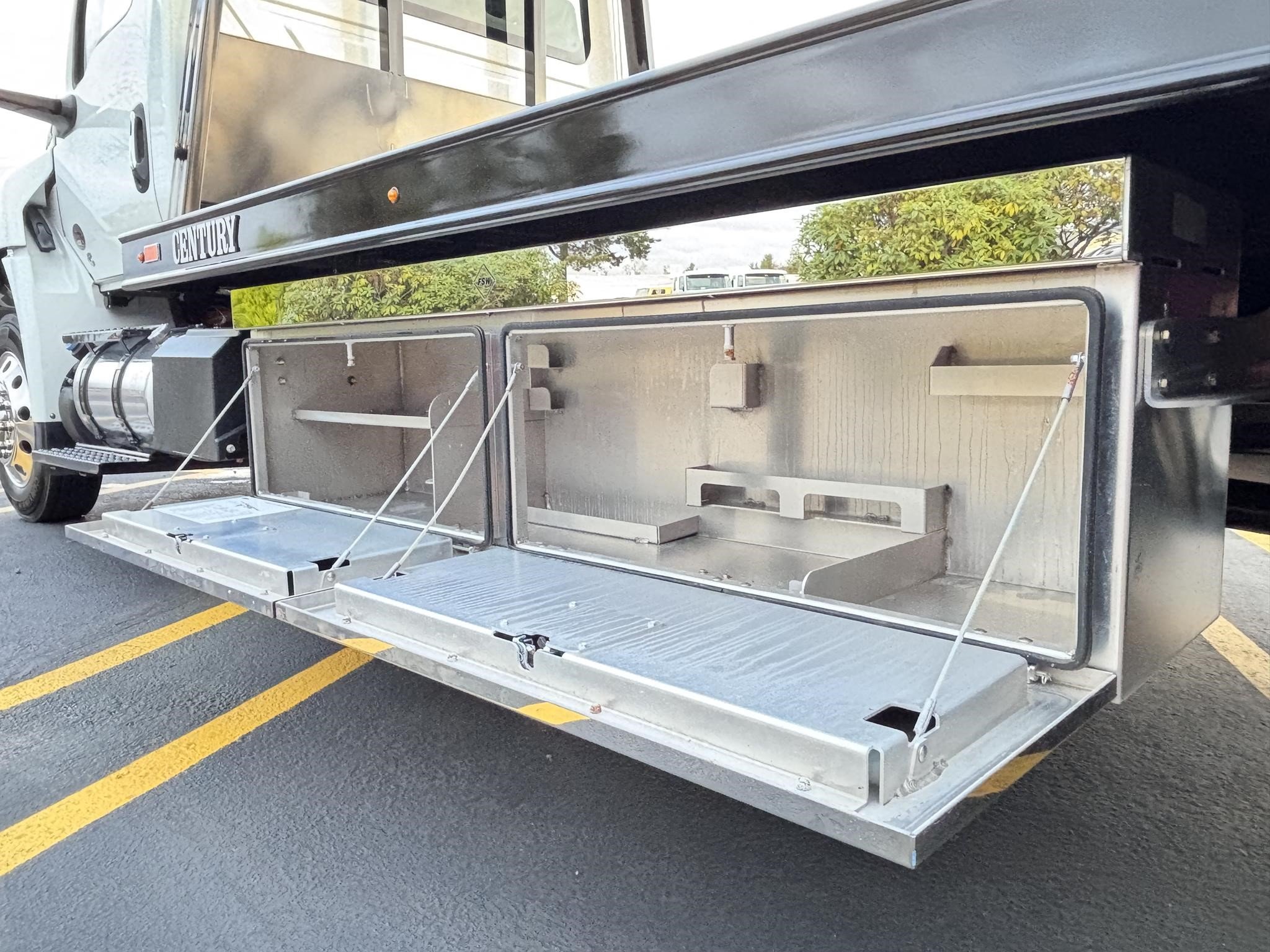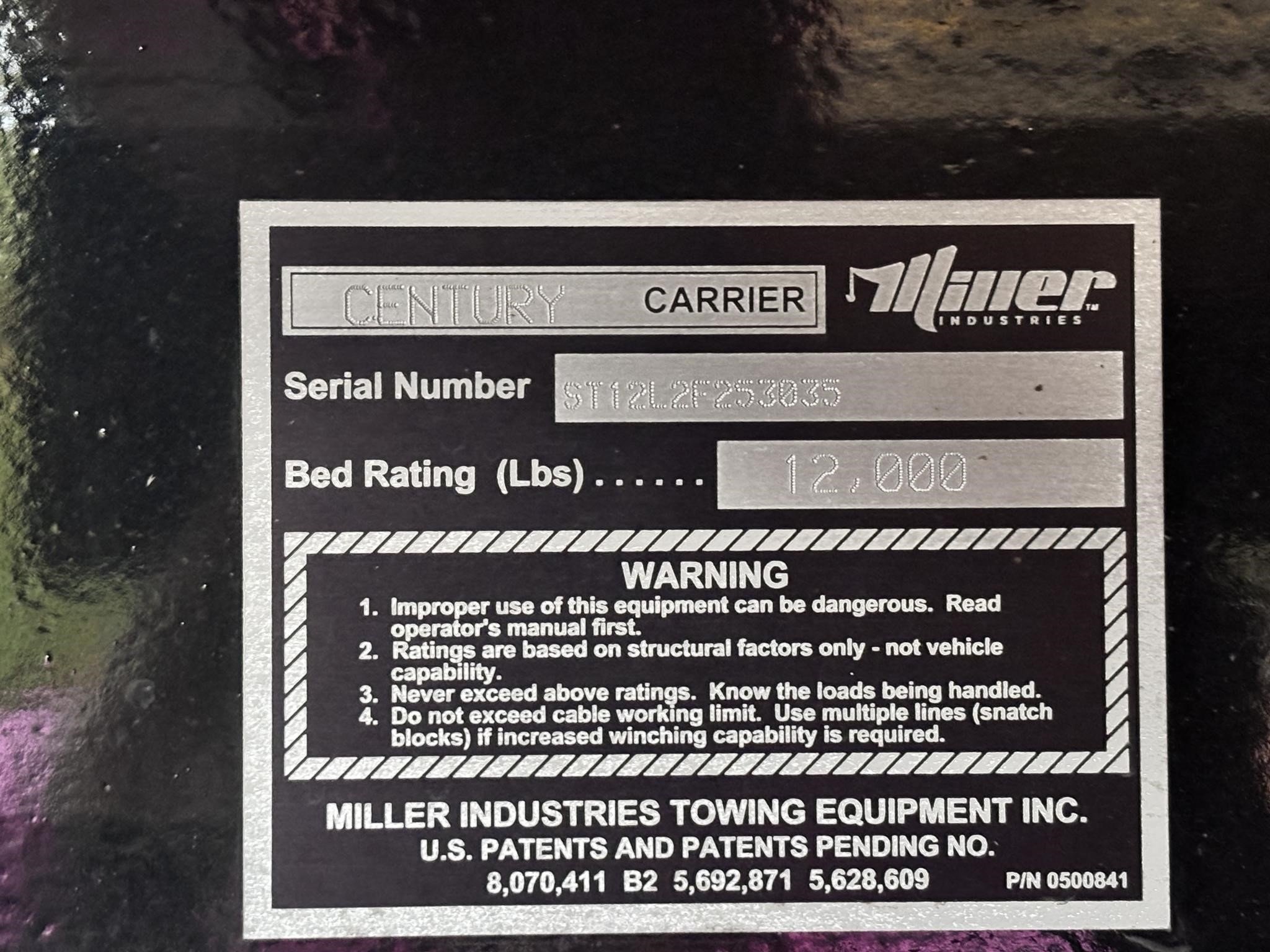 Century Steel LCG (Low Center of Gravity) Carrier w/ Wheel Lift, 3/16 Deck Plate, 3x2 Corten Tube Crossmembers on 8 inch Centers, (4) Rear Chain Locks, (2) Front Chain Locks, (6) Floor Plate Chain Locks (3 per side), 8,000lb Worm Gear Winch, 3/8" x 50' Winch Cable, Illuminated Dual Controls, FMVSS 108 Lamp Group Shock Mounted Lighted, Direct Mount Pump, Cable Roller Guide w/ Tensioner, Winch Free Spool Extension, Back-Up Alarm, (2) Safety Chains, Mechanical Anti-tilt, Black Body Paint, 102" Wide Body, Inboard Tilt Cylinders, Floor Level Roll Formed w/ Punched Stake Pockets, 4,000lb Wheel Lift w/ Releasable L Arms, Fully Hydraulic Wheel Lift, (2) Safety Straps & Ratchets, (2) Rear Safety Chains, Body Lock w/ Nylatron Toller Bearings, & 12,000lb Deck Load Rating. Body SN# ST12L2F253035