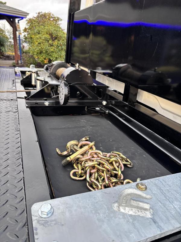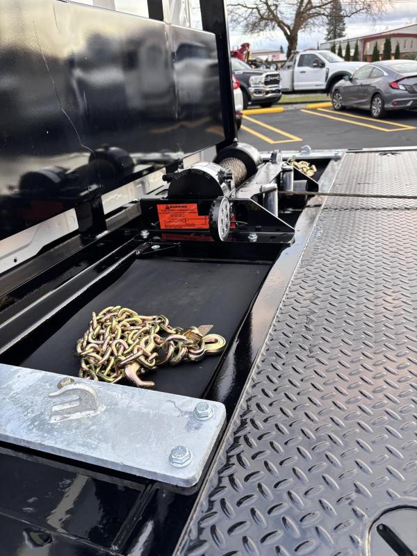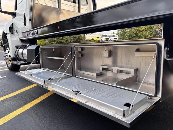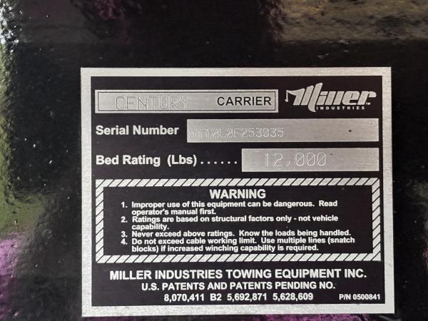 Century Steel LCG (Low Center of Gravity) Carrier w/ Wheel Lift, 3/16 Deck Plate, 3x2 Corten Tube Crossmembers on 8 inch Centers, (4) Rear Chain Locks, (2) Front Chain Locks, (6) Floor Plate Chain Locks (3 per side), 8,000lb Worm Gear Winch, 3/8" x 50' Winch Cable, Illuminated Dual Controls, FMVSS 108 Lamp Group Shock Mounted Lighted, Direct Mount Pump, Cable Roller Guide w/ Tensioner, Winch Free Spool Extension, Back-Up Alarm, (2) Safety Chains, Mechanical Anti-tilt, Black Body Paint, 102" Wide Body, Inboard Tilt Cylinders, Floor Level Roll Formed w/ Punched Stake Pockets, 4,000lb Wheel Lift w/ Releasable L Arms, Fully Hydraulic Wheel Lift, (2) Safety Straps & Ratchets, (2) Rear Safety Chains, Body Lock w/ Nylatron Toller Bearings, & 12,000lb Deck Load Rating. Body SN# ST12L2F253035
