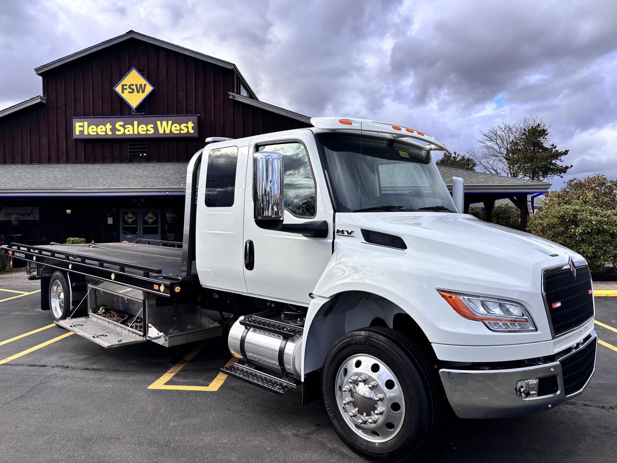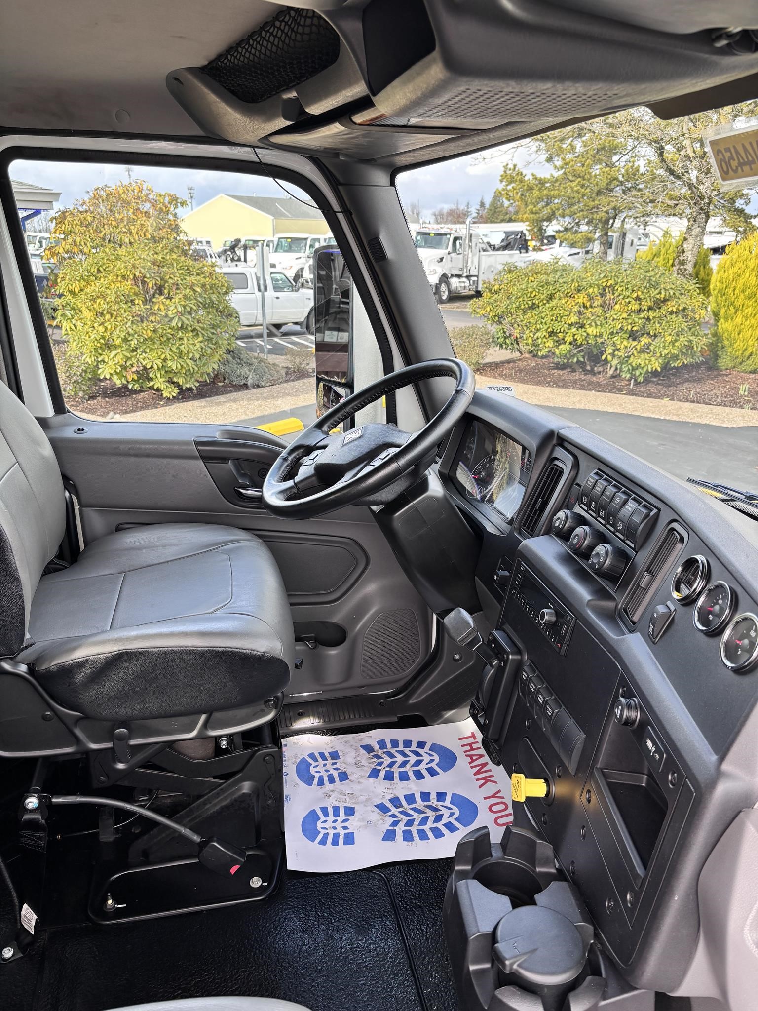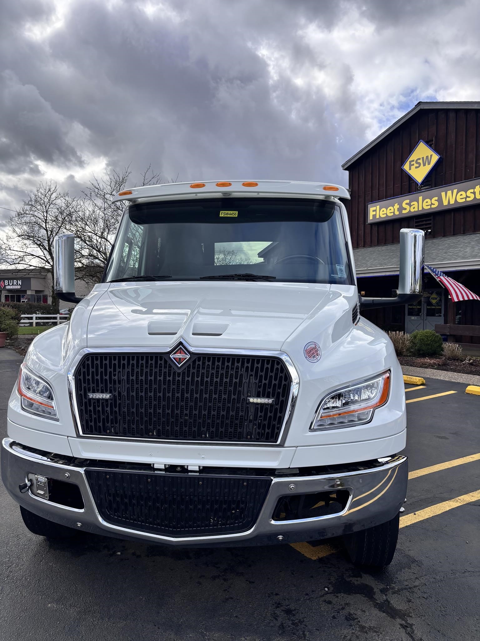 2025 International Model MV Extended cab. Cummins ISB 6.7L, 260HP @ 2,300 rpm, 660 lb-ft @ 1,600 rpm, Allison RDS-2200 6 Speed Auto, Air Brakes, Air Dryer Heater, Exhaust Brake, Front Axle: Dana-Spicer I-Beam 8,000lb w/ Shock Absorbers, Rear Axle: Dana-Spicer 17,500lb, 20,000lb Air Ride Suspension, 4.88 Rear Axle Ratio, Chrome Bumper, black Grille, Air Ride Driver Seat, Air ride Passenger Seat, rear bench seat. Idle Up, Cruise Control, Tilt-Wheel, AM/FM/CD/MP3 w/ Bluetooth, Air Horn, Engine Block Heater, Dual 40-50 Gal Alum Fuel Tanks, 7 Gal DEF Tank, Power Windows, Power Door Locks, Power heated Mirrors. A/C, 255/70R22.5 Tires w/ 22.5 Alum Wheels, Cup holders.Visor 25,500 GVWR,