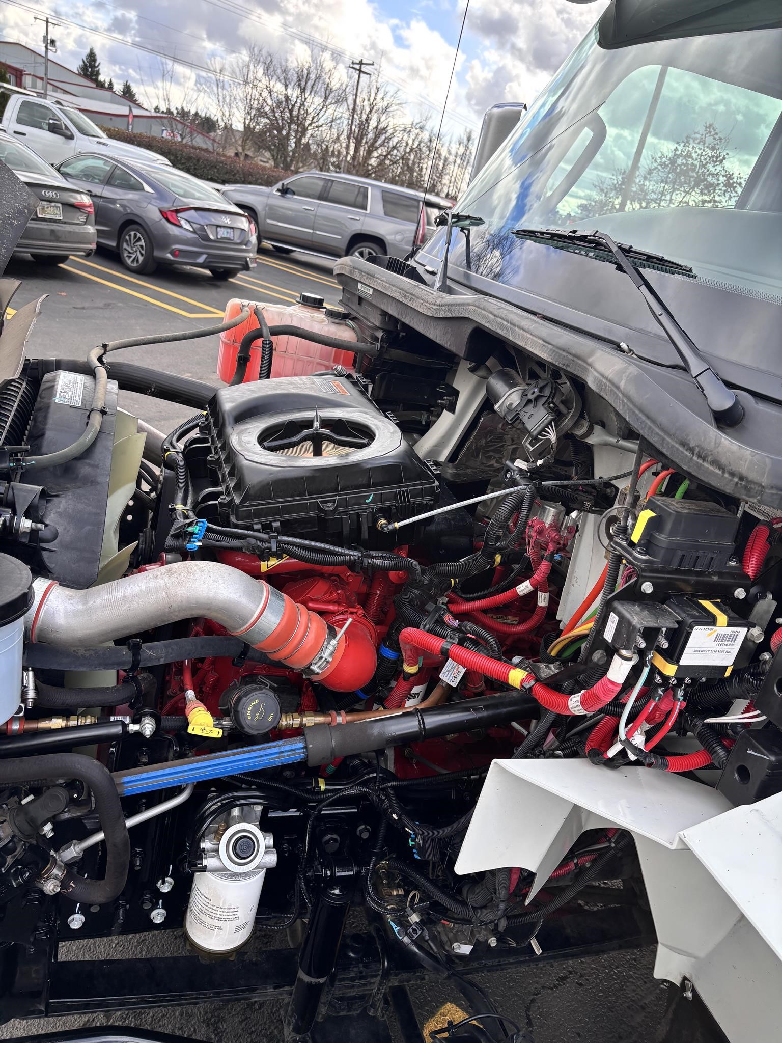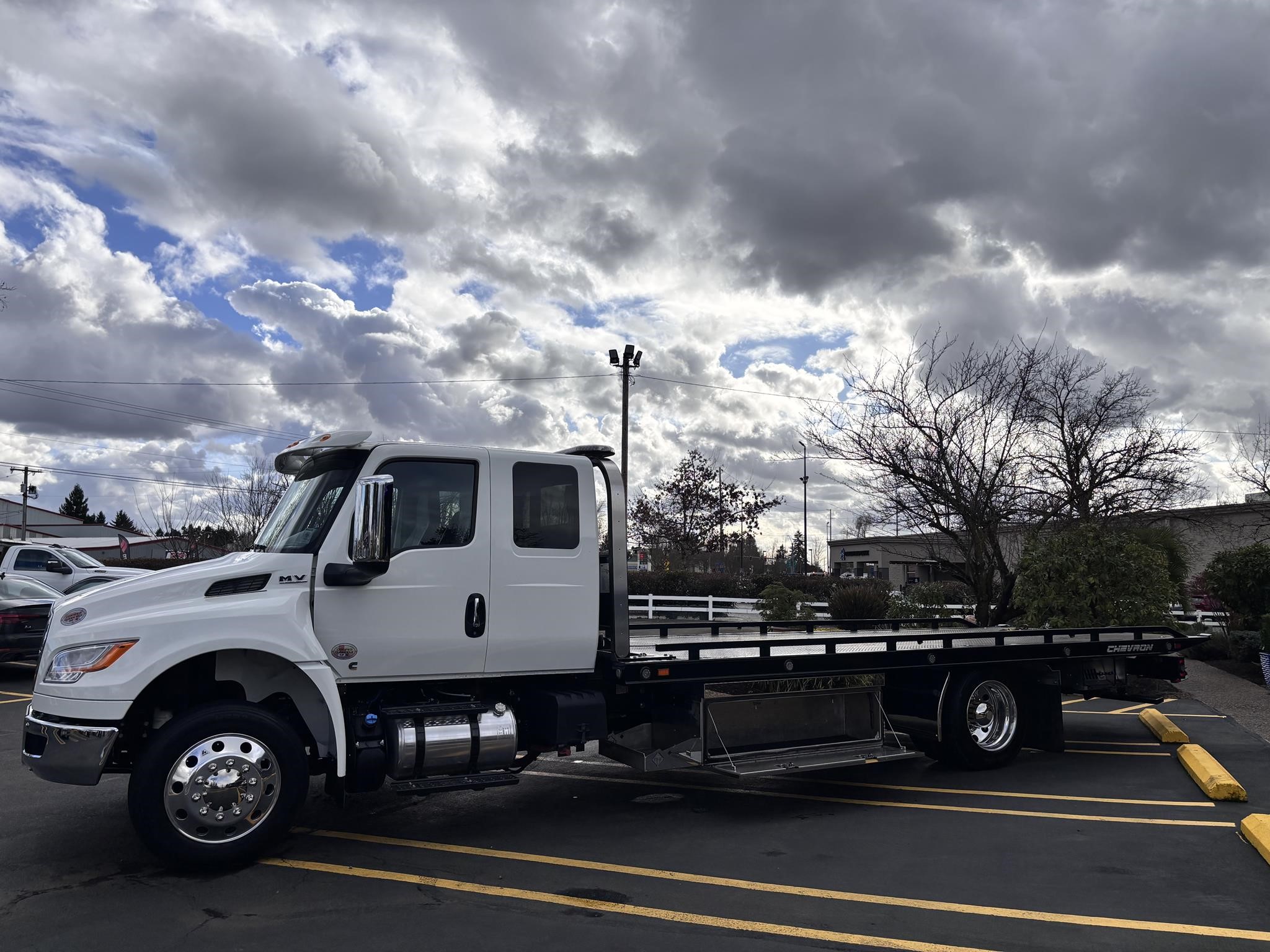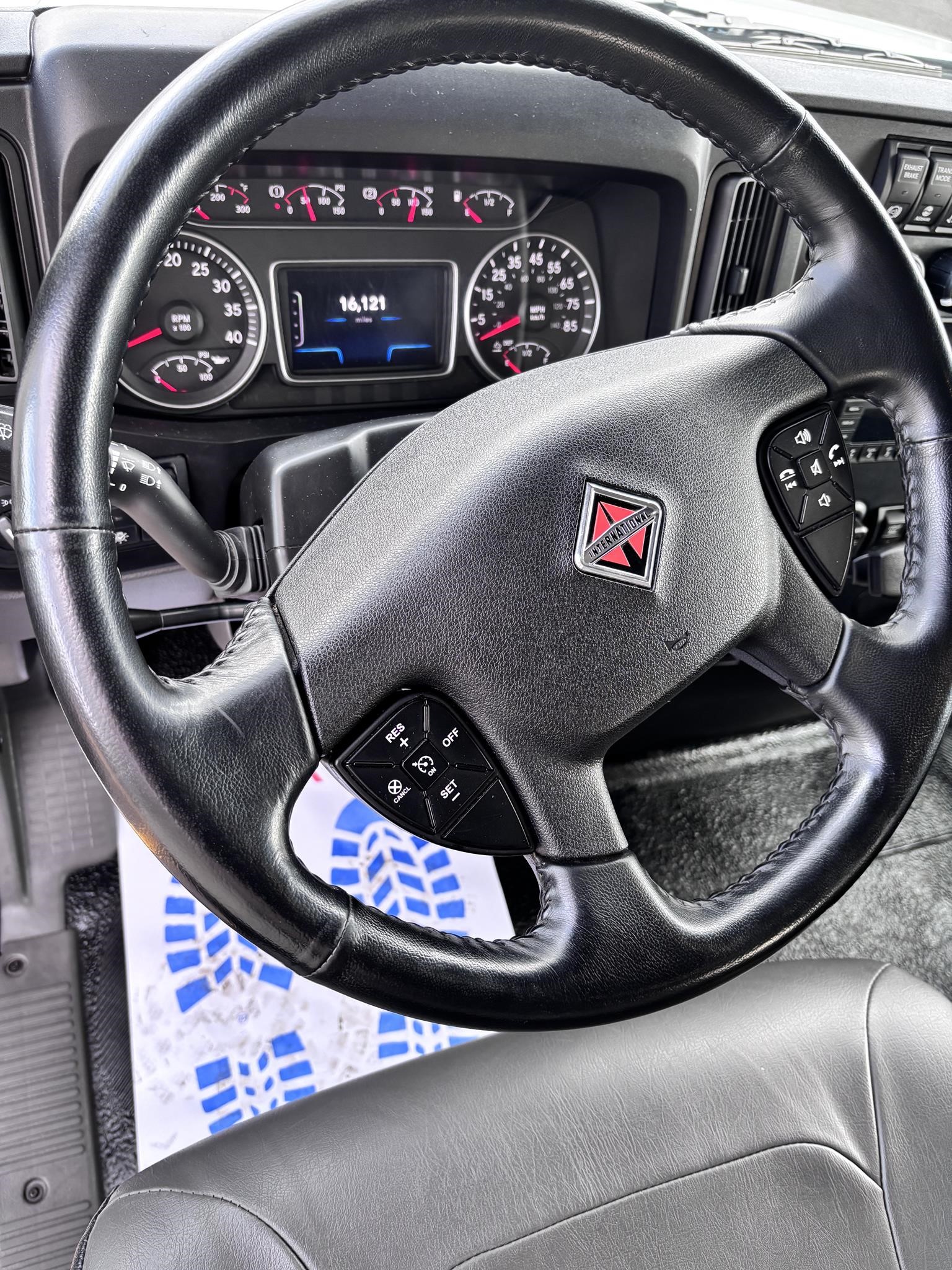 2025 International Model MV Extended cab. Cummins ISB 6.7L, 260HP @ 2,300 rpm, 660 lb-ft @ 1,600 rpm, Allison RDS-2200 6 Speed Auto, Air Brakes, Air Dryer Heater, Exhaust Brake, Front Axle: Dana-Spicer I-Beam 8,000lb w/ Shock Absorbers, Rear Axle: Dana-Spicer 17,500lb, 20,000lb Air Ride Suspension, 4.88 Rear Axle Ratio, Chrome Bumper, black Grille, Air Ride Driver Seat, Air ride Passenger Seat, rear bench seat. Idle Up, Cruise Control, Tilt-Wheel, AM/FM/CD/MP3 w/ Bluetooth, Air Horn, Engine Block Heater, Dual 40-50 Gal Alum Fuel Tanks, 7 Gal DEF Tank, Power Windows, Power Door Locks, Power heated Mirrors. A/C, 255/70R22.5 Tires w/ 22.5 Alum Wheels, Cup holders.Visor 25,500 GVWR,