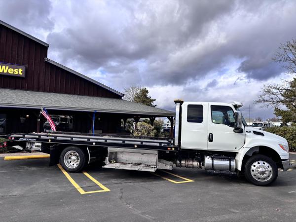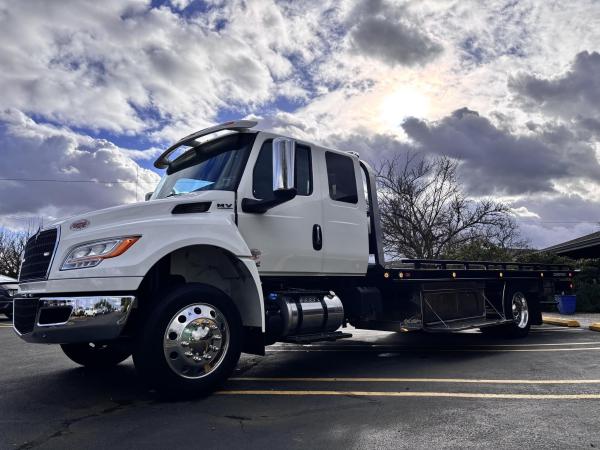 2025 International Model MV Extended cab. Cummins ISB 6.7L, 260HP @ 2,300 rpm, 660 lb-ft @ 1,600 rpm, Allison RDS-2200 6 Speed Auto, Air Brakes, Air Dryer Heater, Exhaust Brake, Front Axle: Dana-Spicer I-Beam 8,000lb w/ Shock Absorbers, Rear Axle: Dana-Spicer 17,500lb, 20,000lb Air Ride Suspension, 4.88 Rear Axle Ratio, Chrome Bumper, black Grille, Air Ride Driver Seat, Air ride Passenger Seat, rear bench seat. Idle Up, Cruise Control, Tilt-Wheel, AM/FM/CD/MP3 w/ Bluetooth, Air Horn, Engine Block Heater, Dual 40-50 Gal Alum Fuel Tanks, 7 Gal DEF Tank, Power Windows, Power Door Locks, Power heated Mirrors. A/C, 255/70R22.5 Tires w/ 22.5 Alum Wheels, Cup holders.Visor 25,500 GVWR,Extended Warranties.- Engine Warranty: 5 yr / 300k miles PPI & after treatment, and Tranny Warranty: 7 yr / Unlimited Miles.