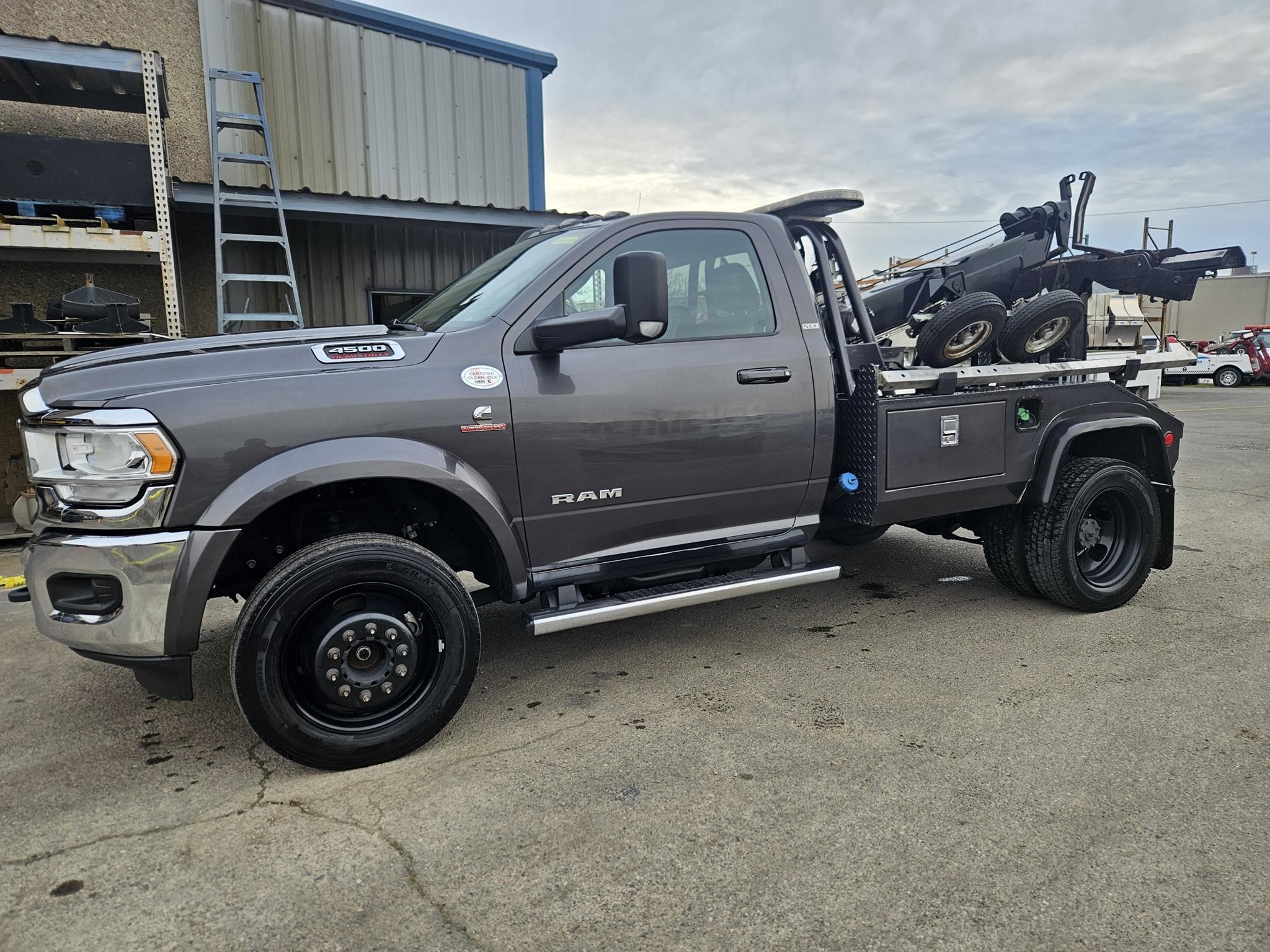 RAM 4500 Cummins 6.7L Diesel. Automatic. Power windows, power locks. Idle up Cruise. Vinyl - 40/20/40 Split Bench seat. Steel wheels. 225/70R 19.5 Tires. 4.44 Rear Axle Ratio. 145” Wheelbase. AM/FM w/Mp player. Keyless Entry. Block heater. 19 gallon Fuel tank.Chrome cab steps . Rear view Camera. Upffitter switches. , 16,000lb GVWR