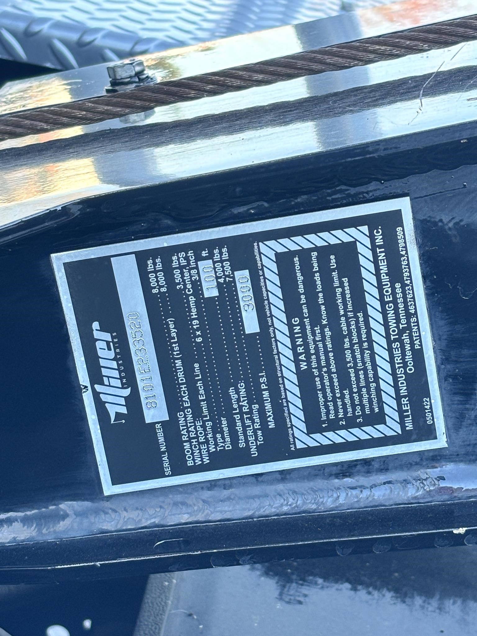 60" Modular Body.8,000lb Recovery boom. 8,000lb planetary Winch with 75' cable. Junction box. Wheelift safety chains pockets. FMVS-108 Lighting. Tire Spacers. Trailer hitch attachment. Driver and passenger side tool compartments. Self-loading wheel lift with w/in-cab controls. Wheel-lift Ratchets/Straps. 73" Reach. 7,500lb tow Rating. Body Serial # 8101E233520