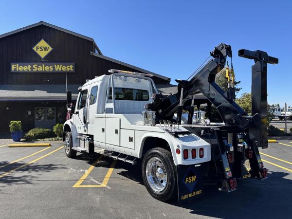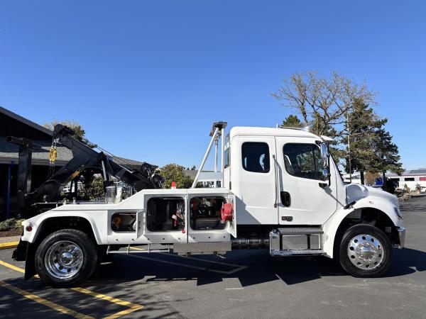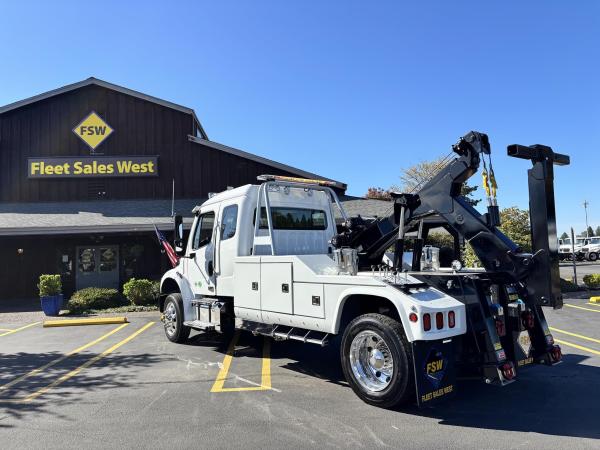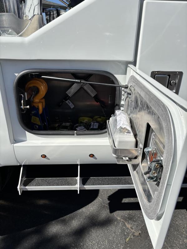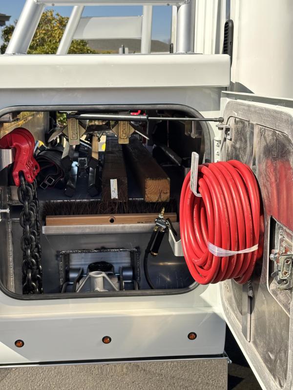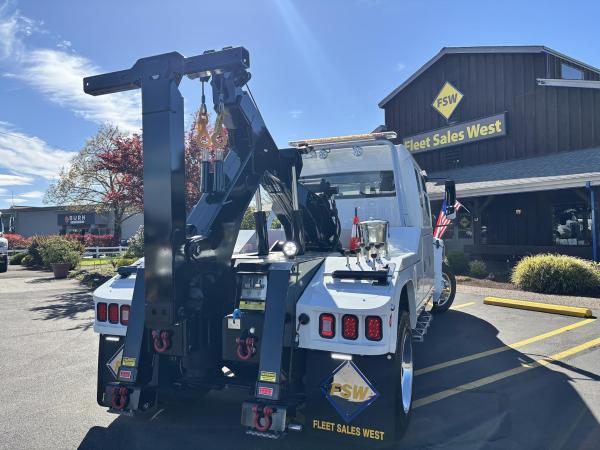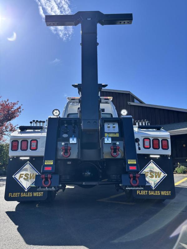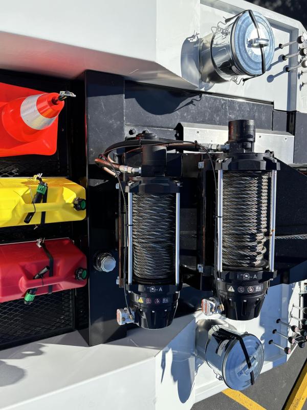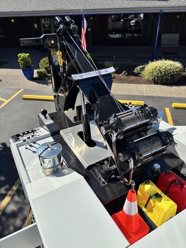 Aluminum modular body sides with two tool compartments on each side. Aluminum 28 in. tunnel through box with tool compartment lights. Tool compartment door closures on all doors “Warn” 12,000 lb. Planetary winches. 7/16” x 150 ft Cable per Drum. Cable Tensioners. Air Free Spool Winches (2) Switches on the Rear tailboard. 108” CA 6000 lb. L-arms. Elevated fork holders. Wheel straps and ratchets. Safety chain pockets. Safety chains.FMVSS 108 lighting (L.E.D.). Junction box with wire harness; pilot-operated holding valves. Lubrication fittings on all pivot points. Dual rear controls. Rear shackles. Two light plugs. Backup alarm. Mudflaps. 3-inch forks.4-inch forks; Spring shackle adapters. Low-profile offset fork holders. Under lift crossbar extensions. L-Arm Storage Pockets (Slope of Rear Deck). Body width is 96 inches, boom elevation is 41 degrees, boom reach past the tailboard is 71 inches, and under lift reach from tail. board to center of fork; 78.5 inches; Negative tilt range;10 degrees; Control valve; Sectional, 15 GPM, 2200 PSI; Oil reservoir; 13 gallons; Oil filters (2); 15 GPM, 10 Microns; BOOM;Retracted;24,000; Extended;10,000; Winch (1st layer); 12,000; Under lift; Retracted (forks) 9,900 Extended (forks); 7,000; Tow Capacity (rolling) 20,000. Body Serial # : 5121G234798