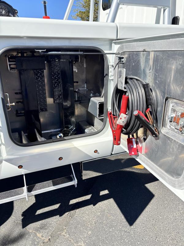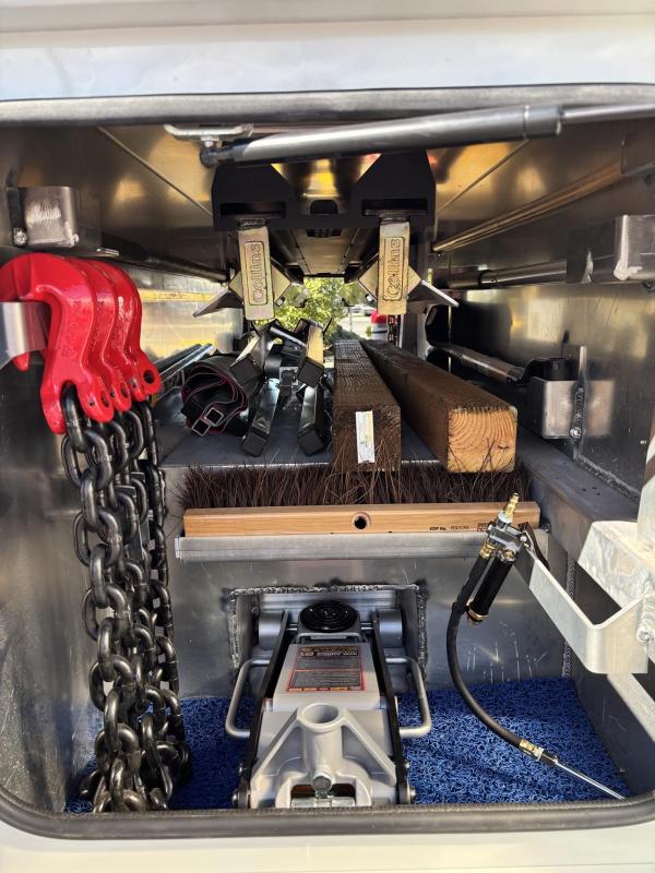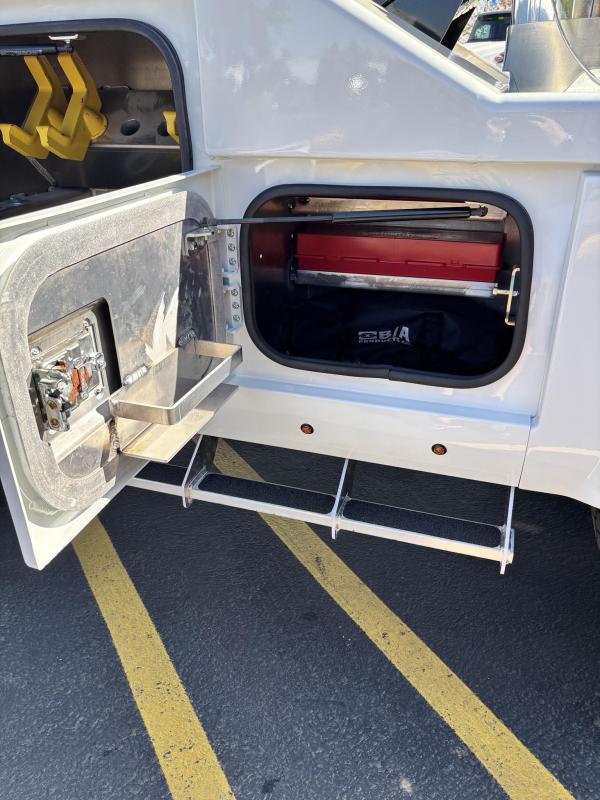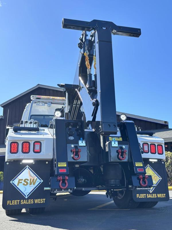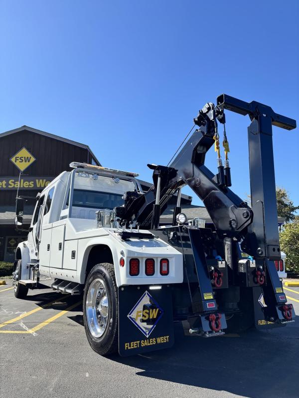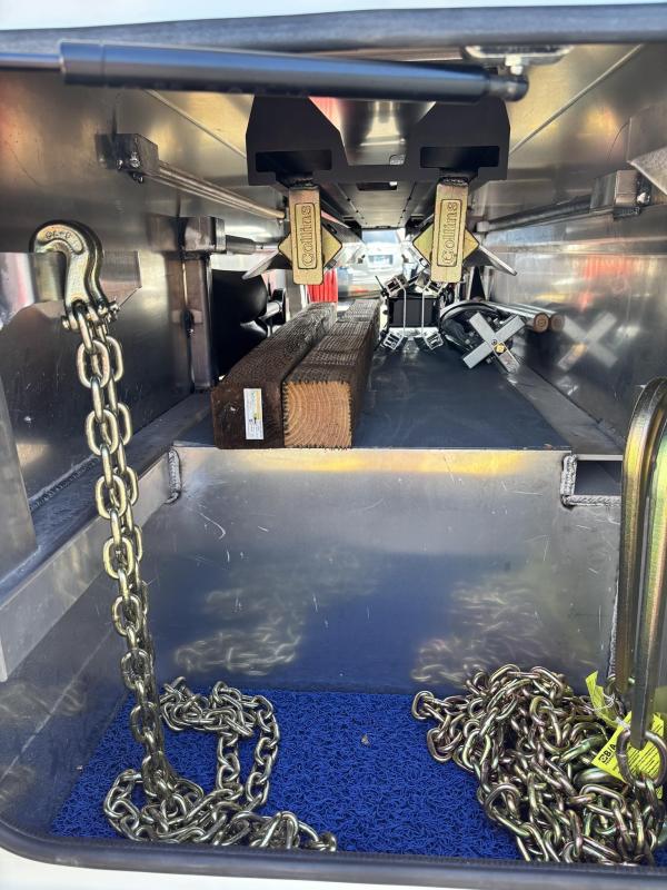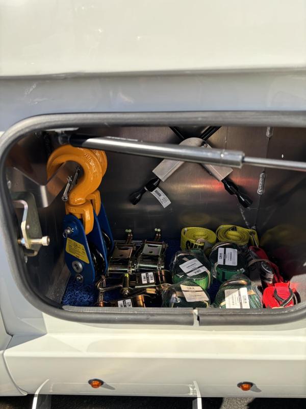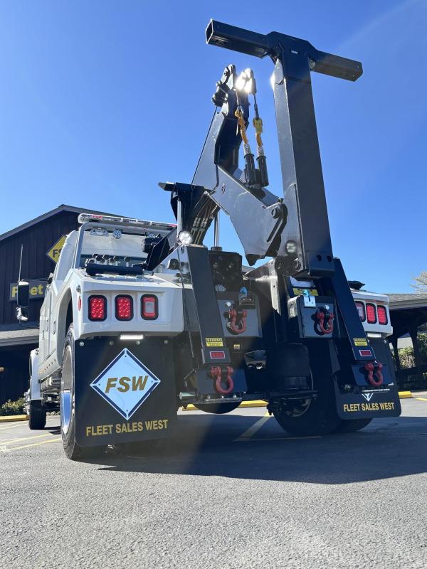 Aluminum modular body sides with two tool compartments on each side. Aluminum 28 in. tunnel through box with tool compartment lights. Tool compartment door closures on all doors “Warn” 12,000 lb. Planetary winches. 7/16” x 150 ft Cable per Drum. Cable Tensioners. Air Free Spool Winches (2) Switches on the Rear tailboard. 108” CA 6000 lb. L-arms. Elevated fork holders. Wheel straps and ratchets. Safety chain pockets. Safety chains.FMVSS 108 lighting (L.E.D.). Junction box with wire harness; pilot-operated holding valves. Lubrication fittings on all pivot points. Dual rear controls. Rear shackles. Two light plugs. Backup alarm. Mudflaps. 3-inch forks.4-inch forks; Spring shackle adapters. Low-profile offset fork holders. Under lift crossbar extensions. L-Arm Storage Pockets (Slope of Rear Deck). Body width is 96 inches, boom elevation is 41 degrees, boom reach past the tailboard is 71 inches, and under lift reach from tail. board to center of fork; 78.5 inches; Negative tilt range;10 degrees; Control valve; Sectional, 15 GPM, 2200 PSI; Oil reservoir; 13 gallons; Oil filters (2); 15 GPM, 10 Microns; BOOM;Retracted;24,000; Extended;10,000; Winch (1st layer); 12,000; Under lift; Retracted (forks) 9,900 Extended (forks); 7,000; Tow Capacity (rolling) 20,000. Body Serial # : 5121G234798
