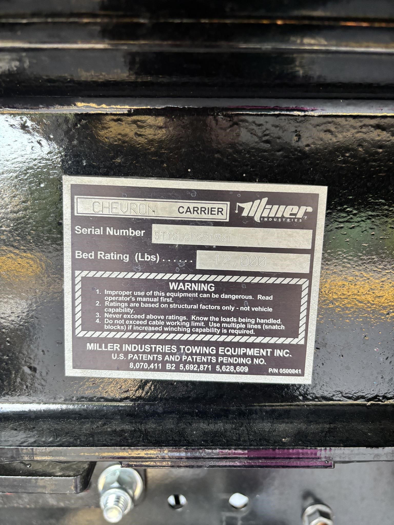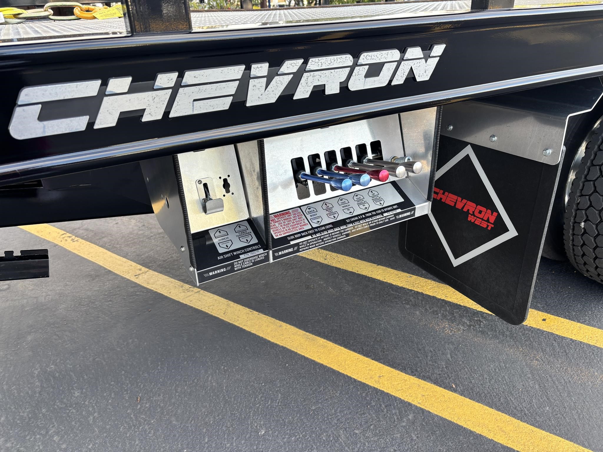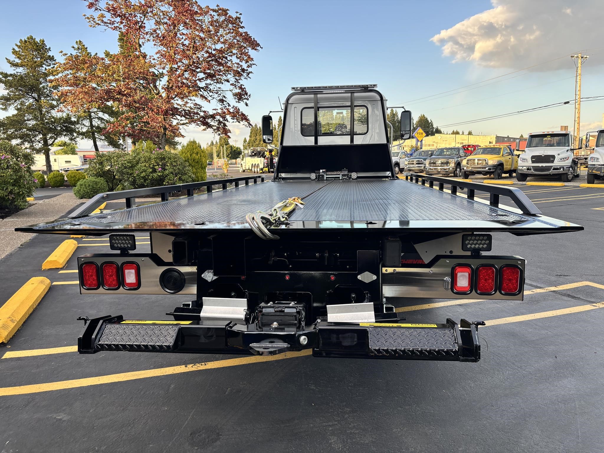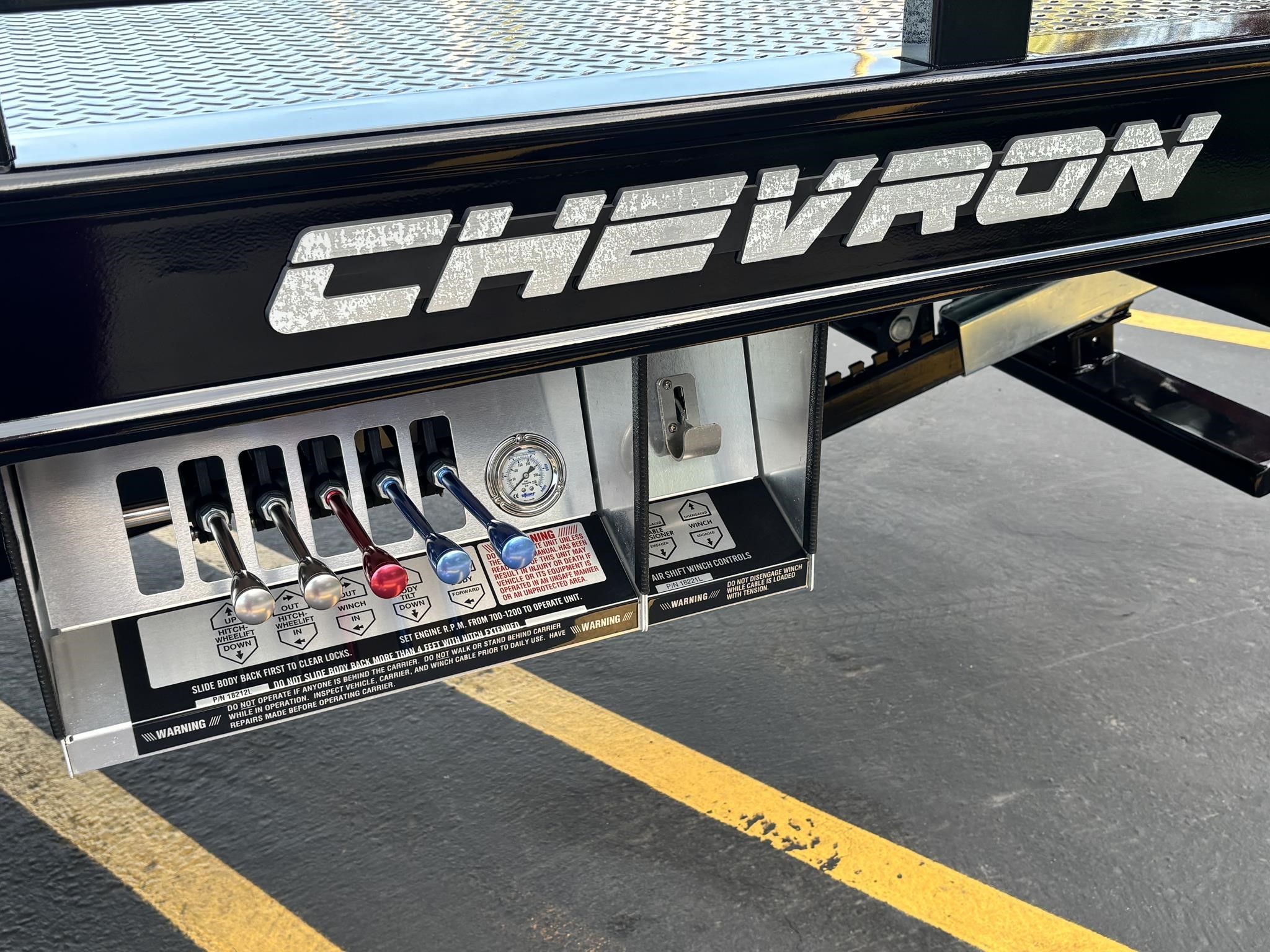 Chevron 21.5' Steel LCG (Low Center of Gravity) Carrier w/ Wheel Lift, 3/16 Deck Plate, 3x2 Corten Tube Crossmembers on 8 inch Centers, (4) Rear Chain Locks, (2) Front Chain Locks, (6) Floor Plate Chain Locks (3 per side), 8,000lb Worm Gear Winch, 3/8" x 50' Winch Cable, Illuminated Dual Controls, FMVSS 108 Lamp Group Shock Mounted Lighted, Direct Mount Pump, Cable Roller Guide w/ Tensioner, Winch Free Spool Extension, Back-Up Alarm, (2) Safety Chains, Mechanical Anti-tilt, Black Body Paint, 102" Wide Body, Inboard Tilt Cylinders, Floor Level Roll Formed w/ Punched Stake Pockets, 4,000lb Wheel Lift w/ Releasable L Arms, Fully Hydraulic Wheel Lift, (2) Safety Straps & Ratchets, (2) Rear Safety Chains, Body Lock w/ Nylatron Roller Bearings, & 12,000lb Deck Load Rating. Body Serial# ST12L2D251931